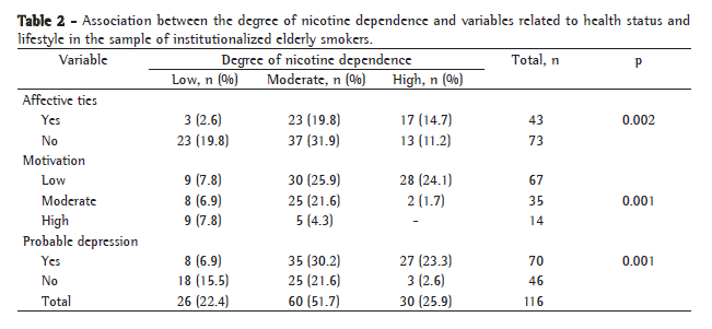 The association between the degree of nicotine dependence and variables related to health status and lifestyle was significant for affective ties, motivation to stop smoking and probable depression (Table 2).