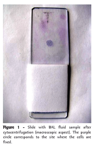 Figures 1 and 2 reveal, respectively, the macroscopic and microscopic aspect of a slide with normal BAL fluid after cytocentrifugation.