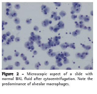 In accordance with the guidelines of the European Respiratory Society (ERS),(3) the BAL fluid can be technically acceptable when the volume recovered is more than 40% of the volume instilled and contains few epithelial cells, as we will discuss later.