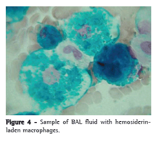 Although lung biopsy is considered the gold standard, the presence of hemosiderin-laden macrophages (HLM) in the BAL fluid is considered crucial for the diagnosis of idiopathic pulmonary hemosiderosis when there are findings suggestive of the disease, such as hemoptysis, interstitial infiltrate in chest X-rays and iron-deficiency anemia.(37,38) One group of authors(38) reviewed data from BAL cell profiles in children to correlate the presence of hemosiderosis with HLM and concluded that the presence of 36% HLM among the total of macrophages corresponded to a sensitivity of 100% and a specificity of 96% for the diagnosis of the disease.