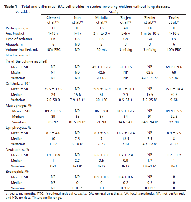 However, future studies on BAL cell profiles in children without lung diseases and in different age brackets are needed. Such studies should adopt protocols that are similar to the ones already used in order to determine reference values, essential for a more accurate interpretation of findings in children with lung diseases.