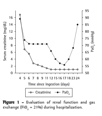 Chest X-ray findings at admission were normal (Figure 2a). Although the patient was not admitted until post-ingestion day 4, the sodium dithionite urine test result (for paraquat) was still positive at admission. He was submitted to hemodialysis and immunosuppressive therapy with cyclophosphamide, methylprednisolone, and dexamethasone, according to the protocol recommended by Lin et al.(3) In addition, he received N-acetylcysteine.
