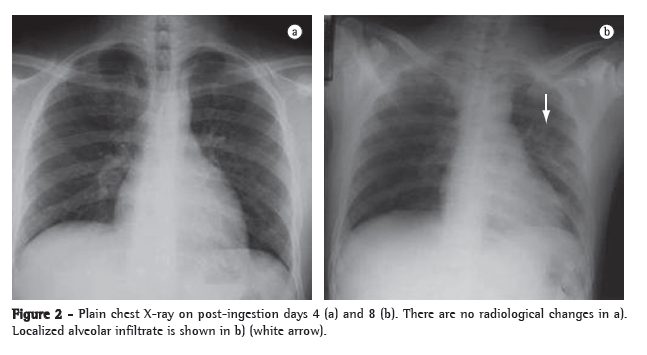 DiscussionWe have presented a typical case of moderately severe paraquat poisoning. However, the outcome was positive, which is rare, and this was probably due to the immunosuppressive therapy, despite the fact that treatment was started long after the ingestion.