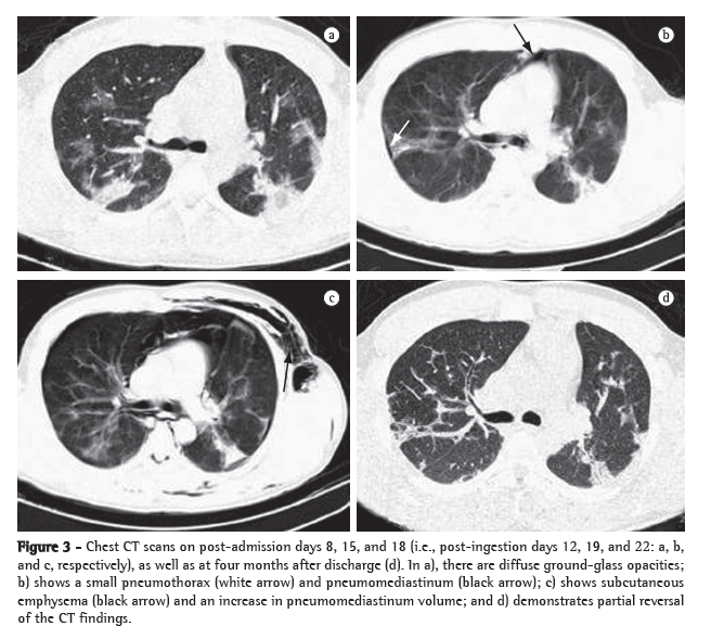 On the second day of hospital admission (post-ingestion day 6), the patient presented hemoptysis. A chest X-ray taken on post-ingestion day 8 showed localized alveolar infiltrate (Figure 2b). Pulmonary opacities, pneumomediastinum, pneumothorax, and subcutaneous emphysema were detected on a chest CT scan (Figure 3). On the seventh day of hospital admission, pulmonary gas exchange parameters worsened (Figure 1), and the patient was submitted to a second course of the same immunosuppressive therapy. Subsequently, despite of an episode of febrile neutropenia, he gradually recovered and was discharged four weeks later in good condition, with no need for home oxygen therapy. Four months later, the patient was working again and had no complaints, except for dyspnea after intense physical exertion. On chest auscultation, crackles were still heard in the lower lung fields, and there was wheezing throughout, together with pleural rub in the right hemithorax. The chest CT scan at four months after discharge is also shown in Figure 3.
