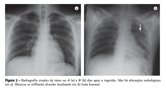 No segundo dia de internação (6º dia após a ingestão), o paciente apresentou hemoptise. A radiografia de tórax realizada no 8º dia após a ingestão mostrou infiltrado alveolar localizado (Figura 2b). Opacidades pulmonares, pneumomediastino, pneumotórax e enfisema subcutâneo foram detectados na TC de tórax (Figura 3). No sétimo dia de internação, os parâmetros gasométricos pioraram (Figura 1), e o paciente foi submetido a um segundo ciclo da mesma terapia imunossupressora. Posteriormente, apesar de um episódio de neutropenia febril, ele se recuperou gradualmente e recebeu alta hospitalar, em bom estado, após quatro semanas, sem necessidade de oxigenoterapia domiciliar. Após quatro meses, o paciente estava trabalhando novamente e não tinha queixas, a não ser por dispneia após esforço físico intenso. Na ausculta torácica, ainda se podiam ouvir crepitações nos campos pulmonares inferiores, e havia sibilância universalmente distribuída, juntamente com atrito pleural no hemitórax direito. A TC de tórax realizada quarto meses após a alta também é mostrada na Figura 3.