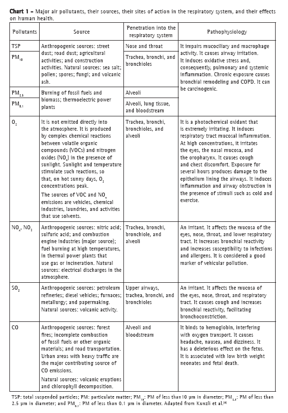 Over the past 250 years-since the Industrial Revolution accelerated the process of pollutant emission, which, until then, had been limited to the domestic use of fuels (mineral and vegetal) and intermittent volcanic emissions-air pollution has been present in various scenarios. Today, approximately 50% of the people in the world live in cities and urban areas and are exposed to progressively higher levels of air pollutants. This is a non-systematic review on the different types and sources of air pollutants, as well as on the respiratory effects attributed to exposure to such contaminants. Aggravation of the symptoms of disease, together with increases in the demand for emergency treatment, the number of hospitalizations, and the number of deaths, can be attributed to particulate and gaseous pollutants, emitted by various sources. Chronic exposure to air pollutants not only causes decompensation of pre-existing diseases but also increases the number of new cases of asthma, COPD, and lung cancer, even in rural areas. Air pollutants now rival tobacco smoke as the leading risk factor for these diseases. We hope that we can impress upon pulmonologists and clinicians the relevance of investigating exposure to air pollutants and of recognizing this as a risk factor that should be taken into account in the adoption of best practices for the control of the acute decompensation of respiratory diseases and for maintenance treatment between exacerbations.