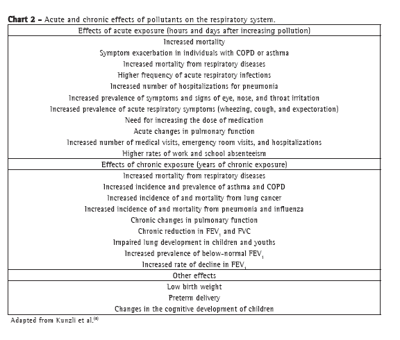 The effects of pollutants on health can be acute or chronic. Acute effects are manifest shortly after exposure (hours or days). Chronic effects are usually assessed in longitudinal studies over years or decades.(8) Chart 2 summarizes the acute and chronic effects of pollutants on the respiratory system.