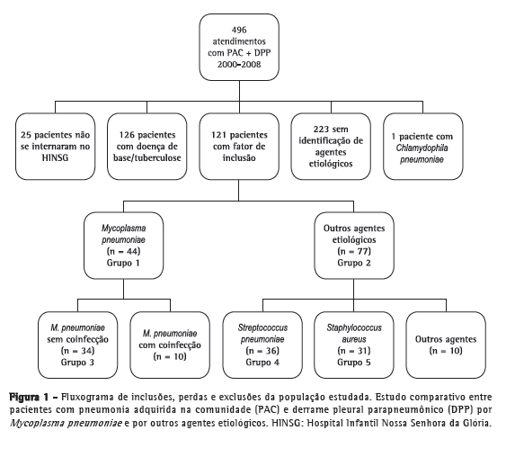 Entre 2000 e 2008, deram entrada no HINSG 496 pacientes com PAC e DPP. Após a utilização dos critérios de exclusão, 345 crianças e adolescentes hospitalizados foram inicialmente avaliados e, dentre esses, 121 casos foram incluídos no estudo devido à identificação do agente etiológico (germes típicos ou M. pneumoniae) e sem a presença de outras bactérias atípicas como único micro-organismo (Figura 1). Os pacientes foram divididos em seis grupos, de acordo com os seguintes diagnósticos: