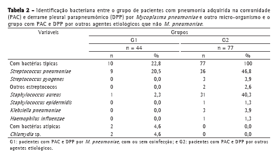 Na comparação entre os pacientes do G1 (com M. pneumoniae) com os do G2 (outros agentes etiológicos), não houve diferença estatisticamente significativa quanto à idade. O número de pacientes com menos de 5 anos no G1 e G2 foi de 31 (70,5%) e 64 (83,1%), respectivamente. A média de idade no G1 e G2 foi de 4,1 e 3,1 anos, respectivamente. Entretanto, quando comparamos o gênero no G1 e G2, 27 pacientes (61,4%) e 32 (41,6%) eram do gênero feminino, respectivamente, havendo uma diferença estatisticamente significativa (p = 0,03). O uso prévio de beta-lactâmicos e a necessidade de transferência de outros serviços para o nosso por falência terapêutica foram mais frequentes no G1 (p < 0,01 para ambos). A duração maior dos sintomas até a admissão, a presença mais frequente de tosse seca e a menos frequente de náuseas ou vômitos também tiveram maior ocorrência no G1 (p < 0,01; p < 0,01; e p = 0,03, respectivamente). Em contraste, durante a internação, a utilização de assistência ventilatória e de dreno torácico foi mais comum no G2 (p = 0,03 e p < 0,01, respectivamente). Somente houve óbitos no G2, em 5 pacientes. Entre os exames complementares, o hemograma apresentou um predomínio de neutrófilos imaturos no G2 (p < 0,01), enquanto proteína C reativa e parâmetros bioquímicos do líquido pleural não apresentaram diferenças estatisticamente significativas entre os dois grupos. Na radiografia de tórax, ocorreu maior presença de derrame pleural de volume mínimo (DPP < 10 mm) no G1 (p = 0,02; Tabela 1). No G1, houve associações com outras bactérias em 12 pacientes, sendo S. pneumoniae a mais frequente, em 9 pacientes (20,5%). No G2, S. pneumoniae também foi a mais frequente, em 36 pacientes (46,8%), seguido por S. aureus, em 31 (40,3%; Tabela 2).
