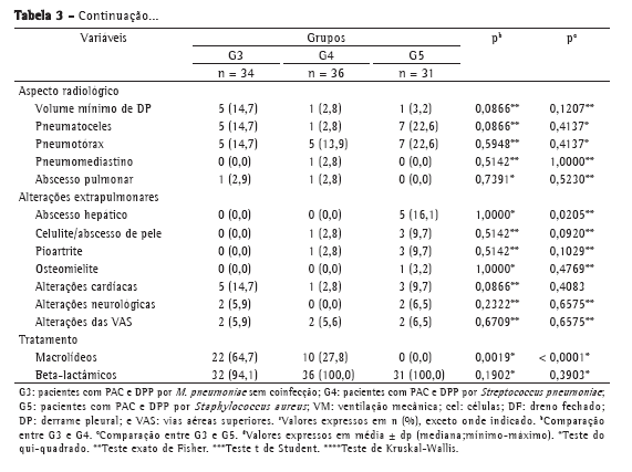 Na comparação entre os pacientes do G3 (M. pneumoniae sem coinfecção) com os do G2, a retirada dos 10 casos de coinfecção com bactérias típicas do G1 praticamente não alterou as variáveis com diferenças estatisticamente significativas (Tabela 1).