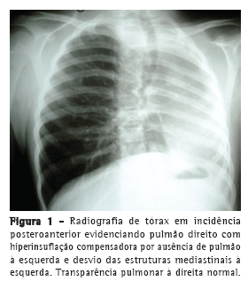 A agenesia pulmonar é uma malformação congênita rara, consistindo na ausência completa do parênquima pulmonar, brônquios e vasos pulmonares.(1-4) A causa é desconhecida. Em 50% dos casos, principalmente naqueles com agenesia pulmonar à direita, estão associadas malformações cardiovasculares, músculo-esqueléticas, gastrointestinais e renais.(3,5-7) O prognóstico é melhor quando a agenesia pulmonar é unilateral à esquerda e quando estão ausentes malformações cardiológicas.(3) No presente relato será apresentado o caso clínico de um menino com agenesia pulmonar esquerda sem outras malformações associadas.