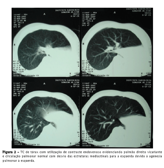 Paciente do sexo masculino, oito anos, branco, procedente da cidade de Jaguarão (RS). Nascido a termo, com pré-natal sem intercorrências. Apresentava história familiar de asma. Apresentava crises de sibilância desde o início de 2006, quando tinha sete anos, sendo tratado no próprio domicílio pela família. Quando procurou atendimento médico em fevereiro de 2007, já havia iniciado tosse seca que evoluiu para sibilância e dispneia durante um mês. Foi hospitalizado em sua cidade. Na radiografia de tórax, realizada na internação, o paciente apresentava opacidade do hemitórax esquerdo, sendo tratada como pneumonia bacteriana (Figura  1). Na avaliação física por um pneumologista, o paciente estava ativo, acianótico e eupneico; havia presença de retração do hemitórax esquerdo, macicez à percussão e ausência de murmúrio vesicular à esquerda com presença de sibilos à direita; na ausculta cardíaca, bulhas rítmicas, normofonéticas sem sopros. Foram solicitados os seguintes exames: TCAR de tórax, broncoscopia, ecocardiograma com Doppler e ultrassonografia abdominal. A TCAR de tórax mostrou agenesia pulmonar à esquerda, pulmão direito vicariante e circulação pulmonar à direita normal com desvio das estruturas mediastinais para a esquerda. Estruturas do abdômen superior sem alterações (Figura  2). A ultrassonografia abdominal e o ecocardiograma mostraram resultados normais. A broncoscopia evidenciou brônquio fonte esquerdo em fundo cego. Dois meses após, o paciente retornou para consulta apresentando quadro  clínico de sibilância, sendo medicado com um β2-agonista, o que resultou em alívio dos sintomas. A radiografia de tórax mantinha as alterações compatíveis com agenesia pulmonar à esquerda. Na espirometria, verificou-se distúrbio ventilatório obstrutivo moderado, com ausência de variação significativa de fluxo e volume após o uso de broncodilatador. Resultados pré-broncodilatador: CVF  =   1,19  L (106% do previsto), VEF1  = 0,60 L/s (56% do previsto) e relação VEF1/CVF  = 0,50 (55% do previsto); resultados pós-broncodilatador: CVF  = 1,21  L (108% do previsto), VEF1  = 0,61 L/s (57% do previsto) e relação VEF1/CVF  = 0,51 (56% do previsto). Em ecocardiogramas de controle, realizados em 2008 e 2009, ficou evidenciado aumento do ventrículo direito (diâmetro de ventrículo direito de 29 mm; valor de referência de 7-18 mm) com fluxo pulmonar normal e ausência de comunicações, shunts ou obstruções intracardíacas.