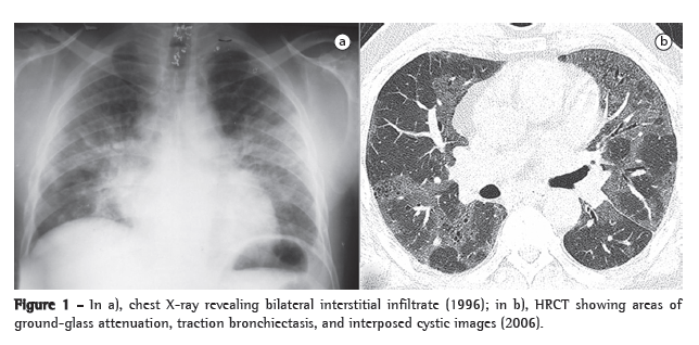Treatment with immunosuppressants (azathioprine and pulses of cyclophosphamide) and prednisone was initiated, resulting in clinical improvement as well as in radiological and functional stability. Figure 3 summarizes the clinical and functional evolution of the patient, correlating it with the diagnostic and therapeutic procedures to which the patient was submitted over the course of his evolution.
