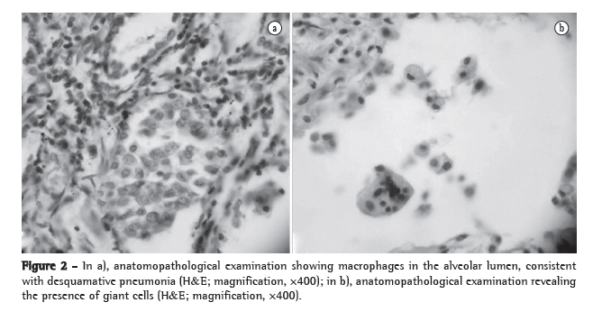 A 50-year-old male patient sought treatment at our facility. He had worked as an industrial plumber on an oil platform for 9 years and had been admitted to another hospital in 1996 for the investigation of dyspnea on exertion, mild productive cough, evening fever and arthralgia (all of which had started 5 years before that admission and had worsened 3 months prior). The patient reported having been treated for pneumonia on four occasions, with temporary improvement, had a history of systemic arterial hypertension and was a former smoker (20 pack-years) who had not smoked for 5 years. A chest X-ray showed bilateral interstitial infiltrate (Figure 1a); spirometry revealed signs of restrictive lung disease (FEV1 = 1.56 L [46.9% of predicted]; FVC = 2.01 L [51.2% of predicted]; FEV1/FVC = 77.9% [91.6% of predicted]); during the six-minute walk test, the patient presented a significant reduction in SpO2, which decreased from 96% to 87%; serology for HIV, hepatitis B and hepatitis C, as well as venereal disease research laboratory test serology, all yielded negative results; FAN = 1:160; and testing for anti-extractable nuclear antigen was negative. The patient was submitted to an open lung biopsy, which revealed desquamative interstitial pneumonia (Figure 2a), and started treatment for idiopathic interstitial pneumonia with prednisone at a dose of 60 mg/day for three months, the dose being tapered. The patient discontinued exposure after the onset of symptoms. He had no medical evaluations between 1998 and 2005, when he sought treatment at the interstitial disease outpatient clinic of our hospital. He was not using any medication, and his pulmonary function had worsened. Physical examination revealed fine crackles in the lower and posterior thirds of both hemithoraces. An HRCT scan showed ground-glass attenuation and weak interposed honeycombing (Figure 1b). The requested review of the slide of the lung biopsy detected the presence of giant cells (Figure 2b). When asked about occupational exposure, the patient revealed having worked as an oil industry plumber, during which time he often assembled tubing using tools (grinders, sanders) containing disks made of hard metal. He reported that those disks became blunt with use and needed to be sharpened, and that his only protection was a visor. He performed this activity, almost continuously, at least five days a week from 1982 to 1991, when the symptoms began. At that time, a chest X-ray requested by the company physician revealed pulmonary infiltrate. The patient was instructed to take a leave from work and seek specialized help. Based on these data, the patient was diagnosed with hard metal lung disease.