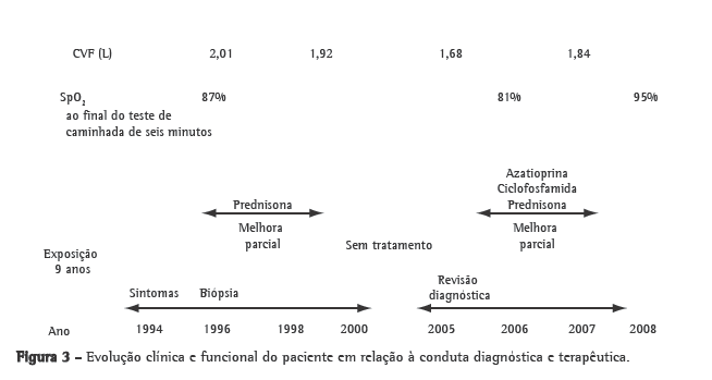Naquela época, a radiografia de tórax solicitada por um médico da empresa revelou infiltrado pulmonar, e o paciente foi orientado a se afastar do trabalho e a procurar auxílio especializado. Com esses dados, foi lhe atribuído o diagnóstico de doença pulmonar por metal duro. Iniciou-se o uso de imunossupressores (azatioprina e pulsos com ciclofosfamida) e prednisona, com melhora clínica e estabilidade do quadro funcional e radiológico. A Figura 3 resume a evolução clínica e funcional do paciente, correlacionando-a às condutas diagnósticas e terapêuticas, às quais o paciente foi submetido ao longo de sua evolução.