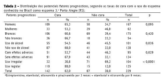 A irregularidade geralmente se deve a problemas psicossociais, como o alcoolismo, que é uma situação reconhecida como de risco para a não adesão ao tratamento,(8,9) mas que pode ser devida também à toxicidade dos medicamentos, que determina interrupções frequentes no uso dos fármacos. Neste estudo, a prevalência de alcoolismo foi de 44,1% e a incidência de reações adversas foi de 41,5%, sendo essa última taxa bem superior à observada com o uso do esquema 1.(4) Observamos que tanto os pacientes alcoolistas, quanto os pacientes com reações adversas, fizeram uso irregular da medicação em proporção significativamente maior do que os demais.
