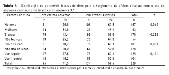 As mulheres e os não alcoolistas apresentaram uma maior proporção de reações adversas. A ocorrência dessas não se mostrou associada com a cor da pele ou com o uso irregular dos fármacos (Tabela 3). Também não houve associação entre as reações adversas e a idade dos pacientes ou entre tais reações e as doses dos fármacos. Na análise multivariada, o uso abusivo de álcool mostrou-se como fator de proteção (OR = 0,46; IC95%: 0,27-0,80; p = 0,006).