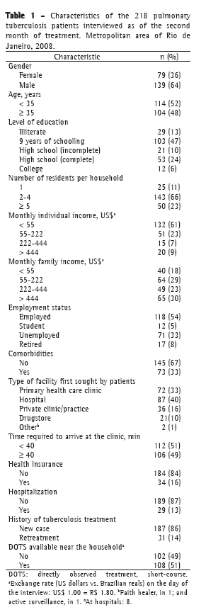 MethodsThis was a cross-sectional study conducted in the state of Rio de Janeiro between April of 2007 and May of 2008. Pulmonary TB patients enrolled in the Tuberculosis Control Programs of the 8 cities investigated in the present study were eligible for inclusion. The inclusion criteria were as follows: presenting with pulmonary TB confirmed by sputum examination (sputum smear microscopy, culture for Mycobacterium tuberculosis, or both); being under treatment for 5-12 weeks (5-12 weeks); being under treatment and having been interviewed in one of 20 primary health care clinics (of which 11 provided DOTS and 9 did not) or in one of 3 hospitals. The 23 health care facilities involved are distributed across 8 cities (Rio de Janeiro, Belford Roxo, Itaboraí, Duque de Caxias, Nilópolis, Queimados, Niterói, and São Gonçalo) that are among the 14 cities with the highest disease burdens in the state of Rio de Janeiro. Those cities account for 72% of the population of the state of Rio de Janeiro, as well as for 86% of all TB cases in the state.(4) A convenience sample of the clinics was selected by the Rio de Janeiro State Department of Health. We excluded patients who had difficulty in speaking and those who were younger than 18 years of age.