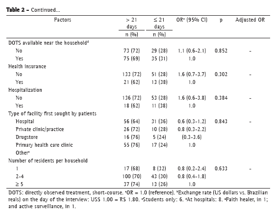 We used a questionnaire to collect demographic and socioeconomic data, as well as data regarding health insurance, clinical history/previous comorbidities, days elapsed between symptom onset and diagnosis of pulmonary TB, time required to commute from the patient residence to the health care clinic, type of facility first sought by the patient, DOTS availability, and hospitalization. The instrument was administered by previously trained students. The time frames were classified as patient delay (time from symptom onset to initial medical visit) and health care system delay (time from initial medical visit to diagnosis). The instrument employed has been validated in various English-speaking and Spanish-speaking countries,(7,8) and the Brazilian Portuguese-language version had been validated in a pilot study conducted prior to the collection of the data presented here.