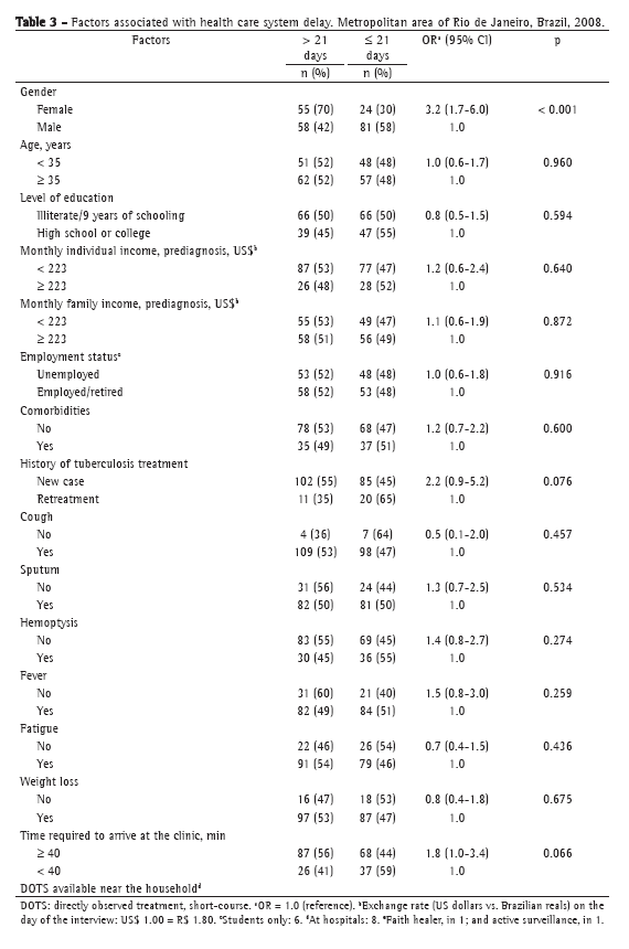 In conclusion, the diagnosis of TB is delayed in the state of Rio de Janeiro, and the delay is principally due to the time elapsed between the onset of symptoms and the first medical visit, especially among women, the unemployed, and individuals with chronic cough. Qualitative studies should be conducted in order to clarify the reasons for the delay in diagnosis. We recommend that the Brazilian National Ministry of Health strengthen the educational campaigns designed to provide information regarding the symptoms of TB, especially those that target women. Finally, we recommend that the Rio de Janeiro state health care system be streamlined in order to improve access to primary health care clinics and hasten the diagnosis of TB. We also recommend that active surveillance be performed among women. The implementation of such measures could reducing the delay in establishing a diagnosis of TB.