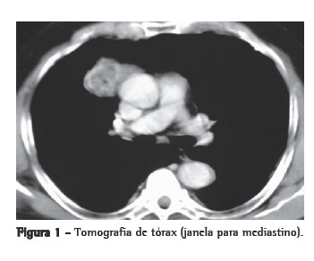 Relato de casoPaciente de 66 anos, do sexo masculino, natural de São Luiz (MA) e procedente de São Paulo, sem antecedentes mórbidos e sem história de tabagismo, foi admitido no ambulatório sem queixas e em bom estado geral. Trazia exame radiológico, realizado em outro serviço há dez anos, revelando a presença de tumor de mediastino anterior, com cerca de 4 cm de diâmetro. A investigação prosseguiu com a realização de uma nova radiografia e uma nova tomografia computadorizada de tórax, as quais revelaram um tumor de contornos espiculados, medindo 3,0 × 4,0 cm, localizado no mediastino anterior à direita e com as mesmas características encontradas nos exames realizados anteriormente (Figura 1). Apresentava exames laboratoriais e prova de função pulmonar normais. Os marcadores tumorais estavam normais. Foi confirmado o diagnóstico sindrômico de tumor de mediastino anterior, e indicado tratamento operatório.