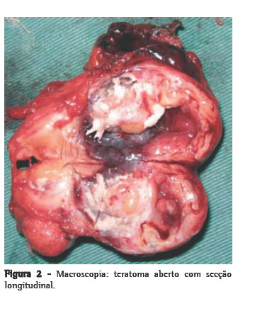 Histologicamente caracteriza-se por apresentar áreas císticas e sólidas. Pode conter dentes, pele e pêlo (folheto ectoderma); cartilagem e osso (folheto mesodérmico); e tecido brônquico, intestinal ou pancreático (folheto endodérmico).(5,8) No caso aqui relatado, foram encontrados tecidos cartilaginoso, epidérmico e ósseo, e também pêlos.