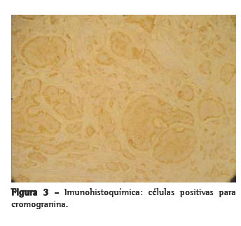 No estudo anatomopatológico da peça, foram encontradas células com núcleos regulares e aspecto em sal-e-pimenta no interior do teratoma. A imunohistoquímica dessa região mostrou-se positiva para cromogranina, o que é característico de tumor carcinóide.(14)