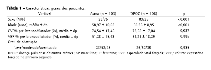ResultadosDos 211 pacientes envolvidos no estudo, 103 (49%) tinham diagnóstico de asma e 108 (51%) tinham diagnóstico de DPOC. Embora tenham sido incluídos apenas pacientes com idade acima de 40 anos, os portadores de DPOC eram mais velhos (66 ± 9 anos vs. 59 ± 11 anos, t = 5,47, p < 0,001) e em sua maioria do sexo masculino (73% vs. 27%, χ2 = 52,2, p < 0,001). A mediana do tabagismo entre os portadores de DPOC foi de 50 anos-maço (15 a 234 anos-maço). Os valores de percentagem de VEF1 pré-broncodilatador foram estatisticamente semelhantes nos dois grupos estudados (Tabela 1).