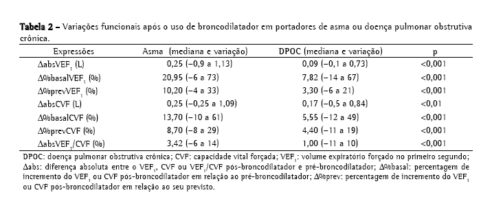 Após o uso de broncodilatador, a CVF aumentou em média de 2,39 L para 2,68 L nos pacientes com asma (p < 0,001) e de 2,91 L para 3,09 L nos pacientes com DPOC (p < 0,001). O VEF1 aumentou em média de 1,32 L para 1,59 L nos pacientes com asma (p < 0,001) e de 1,49 L para 1,61 L nos pacientes com DPOC (p < 0,001). Os demais parâmetros estudados também apresentaram variações estatisticamente significantes nos valores das medianas obtidas para cada uma das variáveis estudadas em ambos os grupos (Tabela 2).