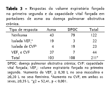 As respostas ao broncodilatador foram classificadas da seguinte forma: 1) ausente - sem elevação significativa tanto do VEF1 quanto da CVF; 2) resposta isolada de VEF1 - aumento absoluto do VEF1 ≥ 0,30 L em homens ou 0,20 L nas mulheres; 3) resposta isolada de CVF - caracterizada por aumento absoluto da CVF ≥ 0,35 L em ambos os sexos; 4) resposta de VEF1 e CVF - com elevação significativa tanto do VEF1 quanto da CVF.