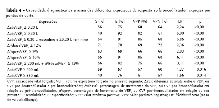 Na Tabela 4, a sensibilidade, especificidade, valores preditivos e razão de verossimilhança são mostrados para as diversas expressões de resposta ao broncodilatador, tomando-se a asma como referência.