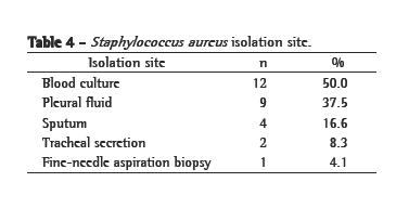 Evaluation of sputum microbiology, pleural fluid and transcutaneous pulmonary aspirate was carried out through direct analysis (Gram, ­Ziehl-Neelsen and 10% potassium hydroxide staining), as well as through culture for bacteria (blood agar, MacConkey agar and chocolate agar media), mycobacteria (Löwenstein-Jensen medium) and fungi (Sabouraud agar medium). Quantitative cultures for gram-positive and gram-negative germs were performed in the evaluation of the tracheal aspirate culture. Blood cultures were analyzed 48-72 h after incubation. Characteristic colonies of gram-positive cocci, together with positive catalase and coagulase, were considered indicative of S. aureus infection. Sensitivity to antibiotics was determined by the diffusion on Mueller-Hinton agar technique, according to standards previously described by Jorgensen et al.(13) Patients in whom S. aureus was isolated only in sputum were not included in the study.