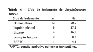 O S. aureus foi isolado mais freqüentemente na hemocultura (50% dos casos) e no líquido pleural (37,5% dos casos). Quatro pacientes apresentaram escarro e hemocultura ambos positivos. Em um paciente, a punção aspirativa pulmonar transcutânea foi o único meio diagnóstico elucidativo (Tabela 4). Em 23 casos (95%), o S. aureus era sensível à meticilina (MSSA, do inglês ­methicillin-sensitive S. aureus), encontrando-se apenas um caso de S. aureus resistente à meticilina (MRSA, do inglês methicillin-resistant S. aureus), em um paciente ancião residente em um asilo.