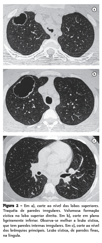 A TC, particularmente com aquisição volumétrica (espiral), é superior às radiografias de tórax no reconhecimento de nódulos ainda pequenos, nas fases iniciais de disseminação pulmonar, por sua melhor caracterização e visualização de vegetações nodulares traqueobrônquicas. Os achados tomográficos incluem estreitamento nodular, focal ou difuso, da via aérea. Os nódulos crescem na superfície mucosa, e sua extensão intraluminar é melhor avaliada por TC.(3) São alterações facilmente correlacionadas à doença quando se dispõe da história clínica de papilomatose.(4) Outros achados relacionados à obstrução das vias aéreas e/ou infecções associadas são atelectasias, consolidações, aprisionamento aéreo e bronquiectasias.(2-4) Na nossa casuística, formações polipóides na traquéia foram observadas em todos os exames tomográficos. Sete pacientes mostravam comprometimento do parênquima pulmonar, caracterizado por lesões nodulares escavadas, com contornos internos irregulares, e paredes de espessuras variadas, com aspecto multilobulado e tendendo à confluência. Nódulos sólidos foram vistos em 6 pacientes. Em nenhum deles detectou-se linfonodomegalia ou derrame pleural.