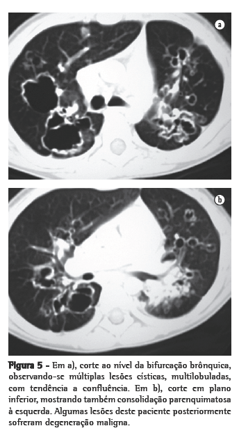 Nos 8 casos foram observadas na TC formações polipóides na traquéia. Em 1 deles, identificou-se também uma lesão em brônquio principal. Sete pacientes mostravam comprometimento do parênquima pulmonar. Em todos foram observadas lesões nodulares escavadas, com contornos internos irregulares, e paredes de espessuras variadas, com aspecto multilobulado em 6 casos, e com confluência das lesões em 5 deles (Figuras 1 a 5). Nódulos sólidos foram vistos em 6 pacientes, Em apenas 1 dos casos foram vistos níveis líquidos. As lesões predominaram nas bases em 3 pacientes, nos terços médios em 2, e em 2 não havia predomínio de distribuição. Em 1 dos pacientes, foi observada associação com massa, e em outro, com consolidação. Neste último paciente (Figura 5) foi constatada degeneração maligna em múltiplas lesões. Sinais de aprisionamento aéreo também foram observados em 1 caso. Em nenhum deles detectou-se linfonodomegalia ou derrame pleural.