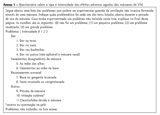 Uma vez que não existem questionários padronizados e validados disponíveis, usamos um questionário escrito desenvolvido pelo nosso grupo para avaliar os efeitos adversos agudos induzidos pelas máscaras de VNI. Parte do questionário foi baseada em um estudo prévio que avaliou os efeitos colaterais do uso de continuous positive airway pressure (CPAP, pressão positiva contínua nas vias aéreas) no tratamento de síndrome da apneia obstrutiva do sono e que incluía seis questões pertinentes a aspectos relacionados especificamente às mascaras (pressão, irritação cutânea, claustrofobia, vazamento, boca/garganta seca e ressecamento nasal e/ou congestão nasal).(19)