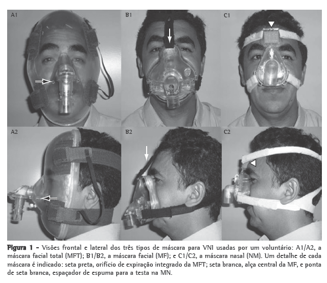 Todas as interfaces são do mesmo fabricante (Respironics, Inc., Murrysville, PA, EUA). A Figura 1 mostra as três máscaras testadas no presente estudo, usando-se um dos voluntários como um modelo: a MFT, a MN (Disposable Contour Deluxe) e a MF. Todas as máscaras possuem acolchoamento em vinil e uma entrada (esta permaneceu fechada para a monitoração da pressão). A MFT tinha uma entrada para monitorização da pressão intramáscara (permite a conexão de uma linha de pressão proximal ou aparelho de monitoração) e, posicionados sobre as bochechas, dois orifícios de exalação integrados (estes permaneceram abertos, de acordo com a recomendação do fabricante). Os volumes internos da MN, MF e MFT são 105 mL, 335 mL e 1500 mL, respectivamente. O estudo foi conduzido em uma sala silenciosa e com ar condicionado no laboratório de pesquisa clínica de um hospital escola.
