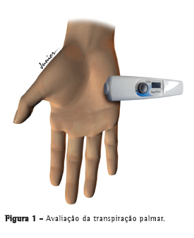 Os pacientes foram submetidos à mensuração da sudorese nas palmas de suas mãos e plantas dos pés através do aparelho. Este é um instrumento portátil, não invasivo, que possui uma câmara de aferição fechada que elimina a interferência externa de correntes de ar (ar condicionado, respiração e abertura e fechamento de portas e janelas), permitindo uma medida precisa da perda de água transepidérmica. Dentro da câmara estão os sensores de umidade relativa e de temperatura. Durante as medições, o instrumento foi posicionado perpendicularmente sobre a pele, permanecendo em contato com a superfície cutânea até que sinalizasse o término da operação de leitura. A taxa de evaporação foi calculada automaticamente pelo instrumento a partir da elevação da umidade relativa do ar dentro da câmara fechada do dispositivo. A medida relaciona o aumento da massa de água (em g) pela área de evaporação (em m2) por unidade de tempo (em h), ou seja, a unidade de medida é g/m2/h.