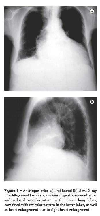 Some cases of emphysema in the upper lobes and pulmonary fibrosis in the lung bases were recently described. These patients present normal spirometry results or mild airway obstruction, and relatively preserved pulmonary volumes, however, with a severe reduction in the diffusing capacity of the lung for carbon monoxide (DLCO). In addition, severe hypoxemia and pulmonary hypertension (PH) may be found.(9)
