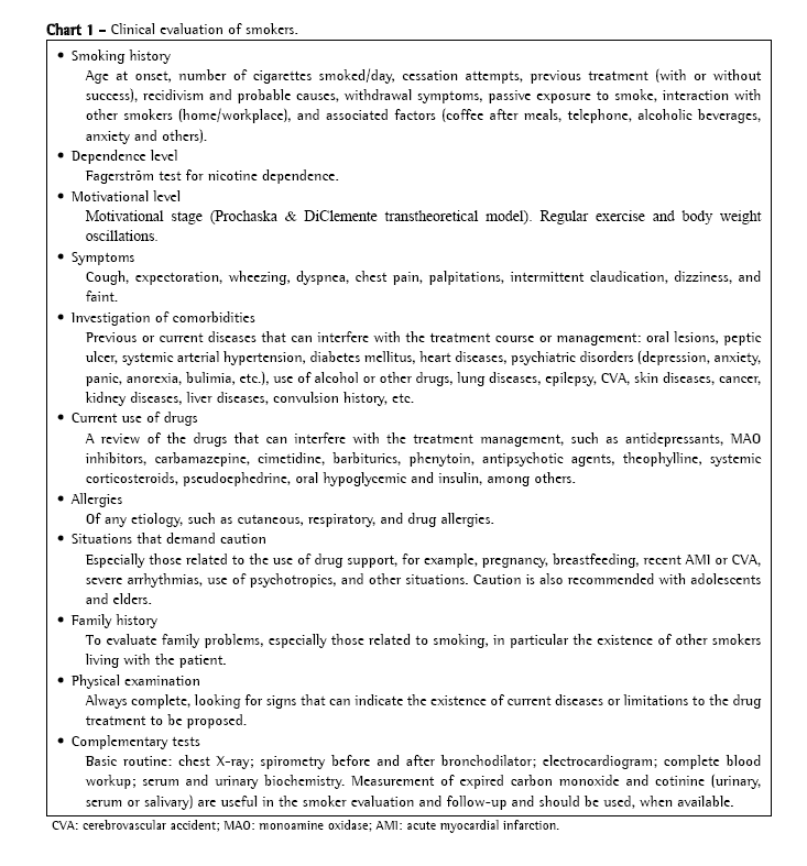 Diagnostic approachClinical evaluationThe smoker should be submitted to clinical evaluation upon admission to the smoking cessation program. The objective is to identify functional alterations in the lungs, the existence of smoking related diseases (SRDs), possible contraindications and drug interactions during the pharmacological treatment of the dependence. The profile of the smoker, the level of nicotine dependence and the motivation to stop smoking are also evaluated at this time.