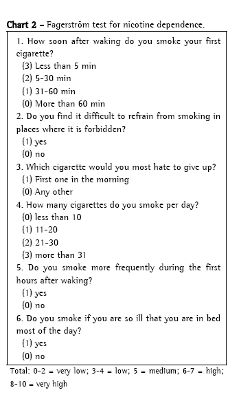 Evaluation of the dependence levelOne of the first instruments developed to evaluate nicotine dependence was the Fagerström Tolerance Questionnaire (FTQ), which consists of eight questions.(3) Another study suggested an index designated the heaviness of smoking index (HSI), which is calculated based on the interval between waking and having the first cigarette of the day, combined with the daily average consumption of cigarettes.(4)