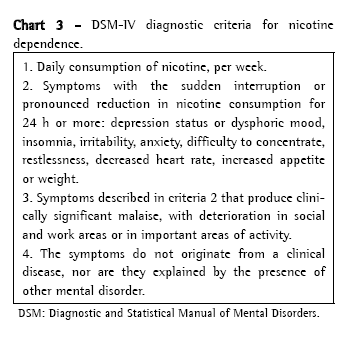 The advantage of the FTQ is that it was specifically developed to evaluate the physical dependence to nicotine. The correlations between FTQ/FTND and the DSM-IV diagnosis of nicotine dependence are weak to moderate, suggesting that these instruments depict different dimensions of nicotine addiction. The DSM-IV criteria are shown in Chart 3.