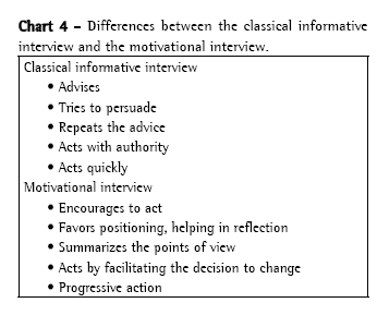 The practice of these fundamentals can reduce anxiety, on the part of the patient as well as on the part of the health professional.(20) Chart 4 shows the principal differences between classical informative interviews and motivational interviews.