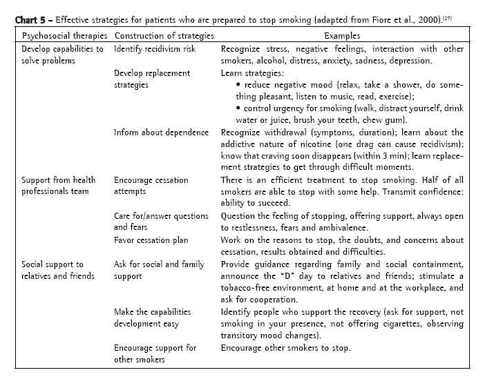 The CBT should be offered either in individual or group treatment. The sessions should take place every week during the first month (cessation), once every 2 weeks during the subsequent three months (until the intensive approach is completed) and once a month thereafter, until one year has passed.(32) Support material should be prepared and provided to patients to reinforce the orientation, having as a model the materials prepared by the Brazilian National Cancer Institute for the national program for smoking control.(33)