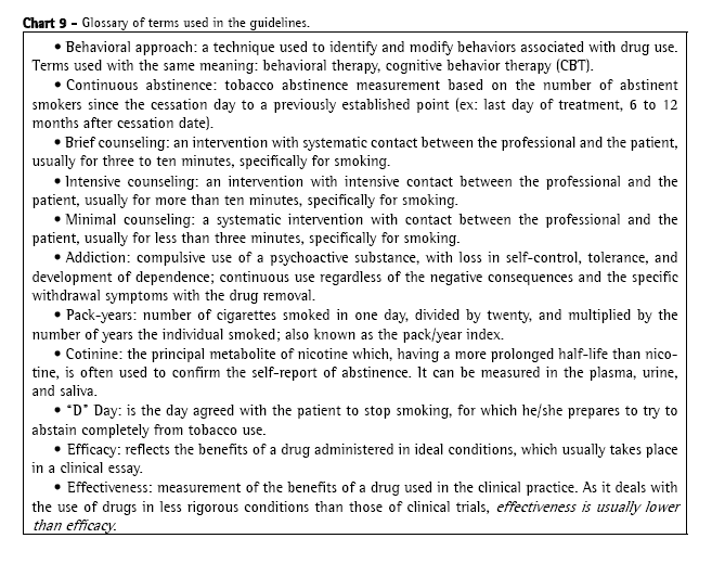 These guidelines are an up-to-date and comprehensive tool to aid health professionals in treating smokers, recommending measures and strategies for managing each case based on clinical evidence. Written in a simplified and objective manner, the text is divided into two principal sections: Evaluation and Treatment. The sections both present comments on and levels of evidence represented by the references cited, as well as some proposals for the reduction of damage and for intervening in specific and still poorly explored situations, such as relapse, passive smoking, physician smoking, and tobacco use in specific environments.