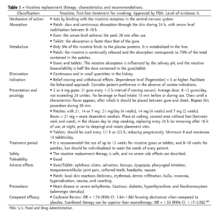 The nicotine tablet is more quickly absorbed by the oral mucosa and is simpler than the chewing gum. The difficulties found in gum management (periodontal diseases and temporomandibular joint) typically do not occur when the tablets are used.(44) Currently, only patches and gums are available in Brazil.