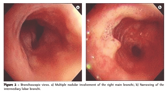 Case reportA retired, hypertensive 67-year-old male, a former smoker and alcoholic, was referred to our facility with complaints of progressive dyspnea, wheezing and chest pain for the last 6 months. A chest X-ray obtained 8 years previously showed right hilar enlargement. He also had a long-standing history of episodic hemoptysis that ceased 10 years prior, together with a history of recurrent respiratory infections. Upon physical examination, he presented diminished breath sounds and slight crackles at the lung bases. A second chest X-ray revealed no changes in comparison with the first. The results of pulmonary function tests (spirometry and the six-minute walk test) and laboratory tests were within normal limits. A recent computed tomography scan of the chest showed partial stenosis of the intermediary and right main bronchi, together with laminar mucosal calcifications extending from the superior third of the trachea inferiorly to stenotic areas, as well as mediastinal lymphadenomegaly (Figure 1). An induced sputum sample tested negative for bacteria, acid-fast bacilli and fungi. Bronchoalveolar lavage revealed a nonspecific inflammatory process.