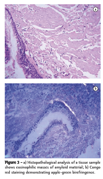 In conclusion, patients with tracheobronchial amyloidosis can present a wide variety of nonspecific symptoms and characteristic findings on imaging exams. The diagnosis is confirmed essentially through fiberoptic bronchoscopy, with appropriate (Congo red) staining of the bronchial tissue samples obtained.