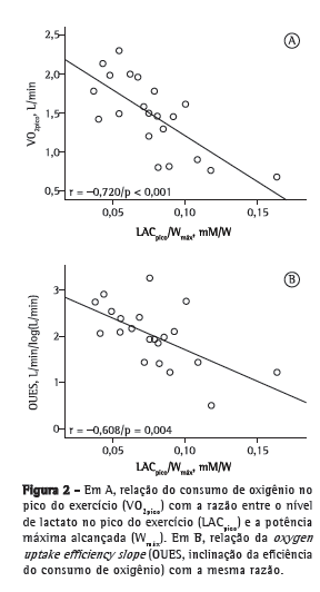 Apesar da alta correlação entre os níveis de lactato no pico do exercício e variáveis como VO2pico e potência máxima, no presente estudo, não observamos uma correlação significativa entre os níveis de lactato máximo e a OUES. Isso pode ter ocorrido por duas razões principais: (i) como a OUES é uma variável submáxima, essa pode representar um sistema linear independente, como foi demonstrado para outras variáveis submáximas, como a variável tau na análise do déficit de oxigênio e o ganho primário da eficiência aeróbia (VO2/potência) no teste de carga constante, tendo sido essas variáveis independentes dos níveis máximos de lactato alcançados(28); e (ii) a OUES pode ser significativamente menor nas mulheres.(29) Essa última possibilidade fica fortalecida quando se ajusta o nível de lactato no pico do exercício para a potência máxima, pois ocorre uma importante correlação desse parâmetro com a OUES, indicando que a capacidade oxidativa dos músculos ajustada para a carga, na máxima taxa metabólica do exercício, reflete de maneira importante a eficiência da captação de oxigênio pelos pulmões. O número pequeno de pacientes do sexo feminino e masculino não nos permite fazer uma análise em separado da possível causa dessa diferença.
