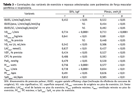 Destacamos ainda a correlação moderada entre a força de preensão palmar e pulso de oxigênio no pico do exercício (r = 0,653; p < 0,01; Tabela 3) e entre esse e PImáx (r = 0,585; p < 0,01; Tabela 3).